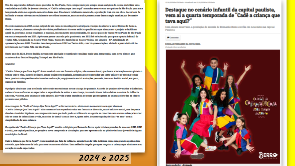 O espetáculo “Cadê a Criança que Tava Aqui?” tem um formato atípico, não convencional, que busca a interação com a plateia o tempo todo e visa, através de jogos, cenas e números musicais, apresentar ao espectador um texto crítico e ao mesmo tempo leve, que trata de questões relacionadas a educação, engajamento social e relações pessoais, tanto no âmbito social em geral quanto no familiar. O próprio título nos traz a reflexão sobre onde escondemos nossa criança do passado. Através de quadros divertidos e dinâmicos, o elenco busca oferecer ao espectador a experiência de voltar a ser criança, trazendo a tona brincadeiras e o sabor da infância.